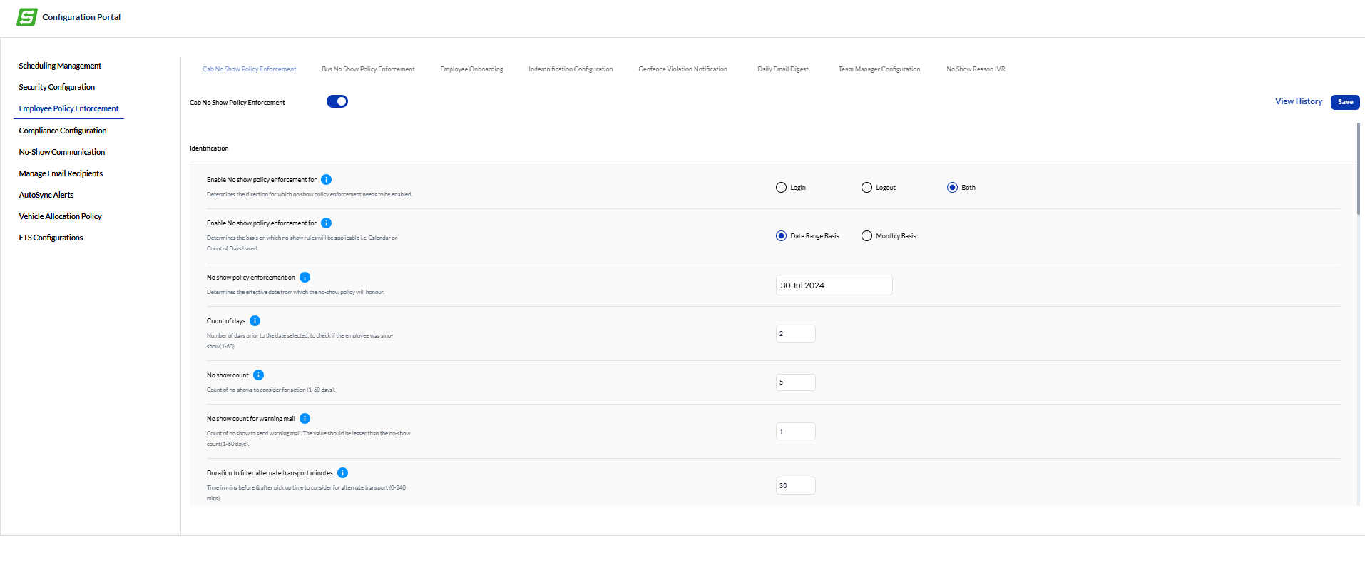 ETS > Site admin > Config Dashboard > Employee Policy Enforcement > No Show Policy Enforcement > Cab No Show Policy Enforcement