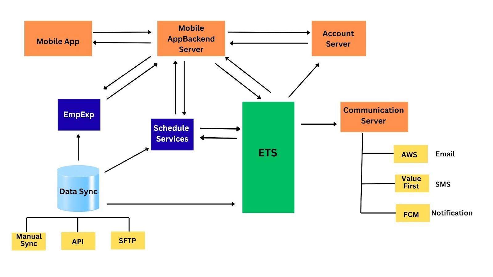 Whenever an event occurs (such as login, trip confirmation, or shift assignment), ETS or other microservices (like Schedule Service or EmpExp) send a communication request to the Communication Server.